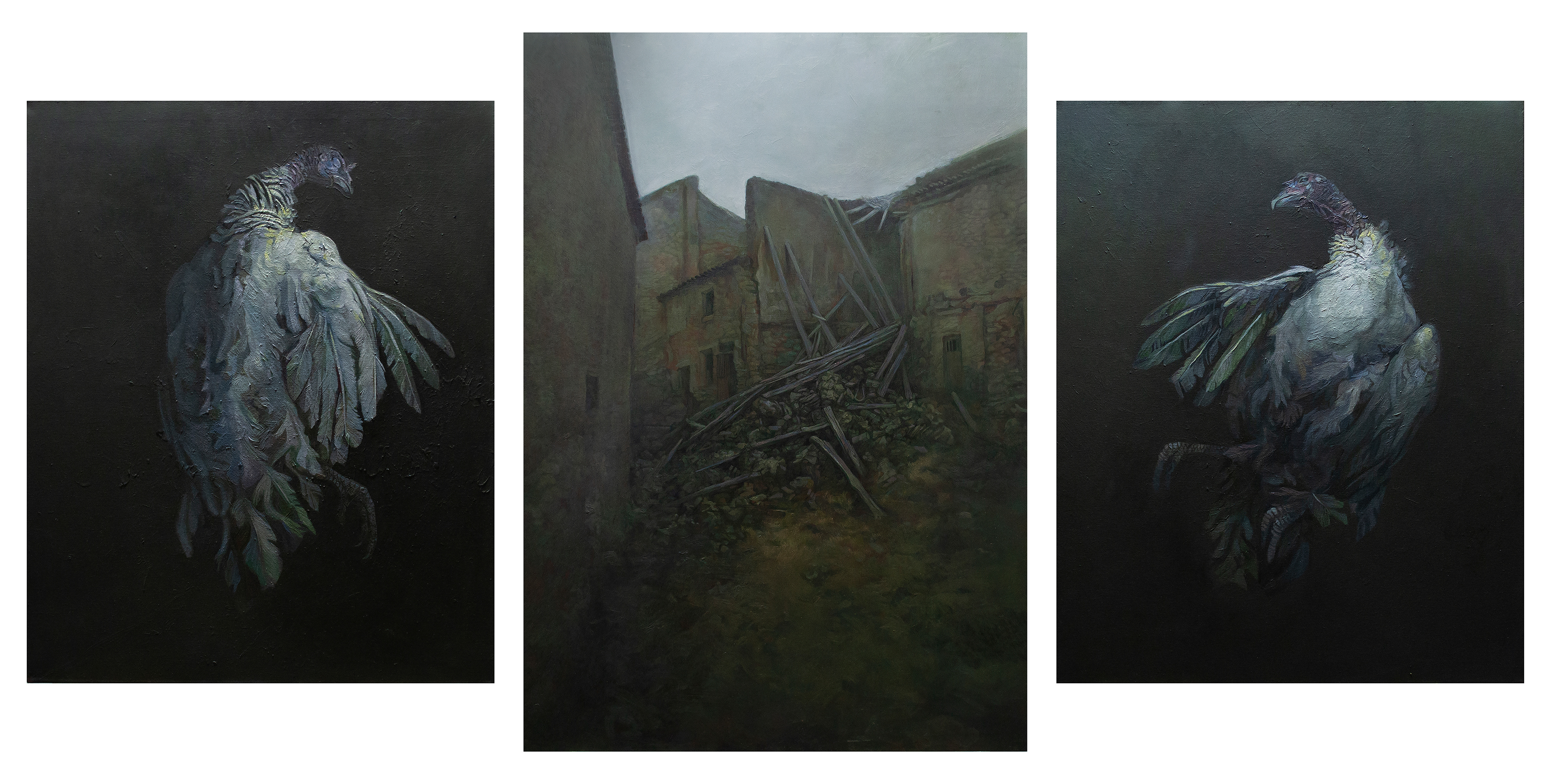 Este tríptico conecta experiencia personal, memoria oral y observación del territorio. La obra reflexiona sobre la incompatibilidad de las razas industriales —frágiles y dependientes de la tecnología— con el manejo rústico tradicional, en contraste con las razas autóctonas casi extinguidas. Al unir la caída de los pavos industriales con el derrumbe de los antiguos cortijos, la pieza simboliza una doble pérdida: la del paisaje agrario y la de los saberes que lo sostuvieron.